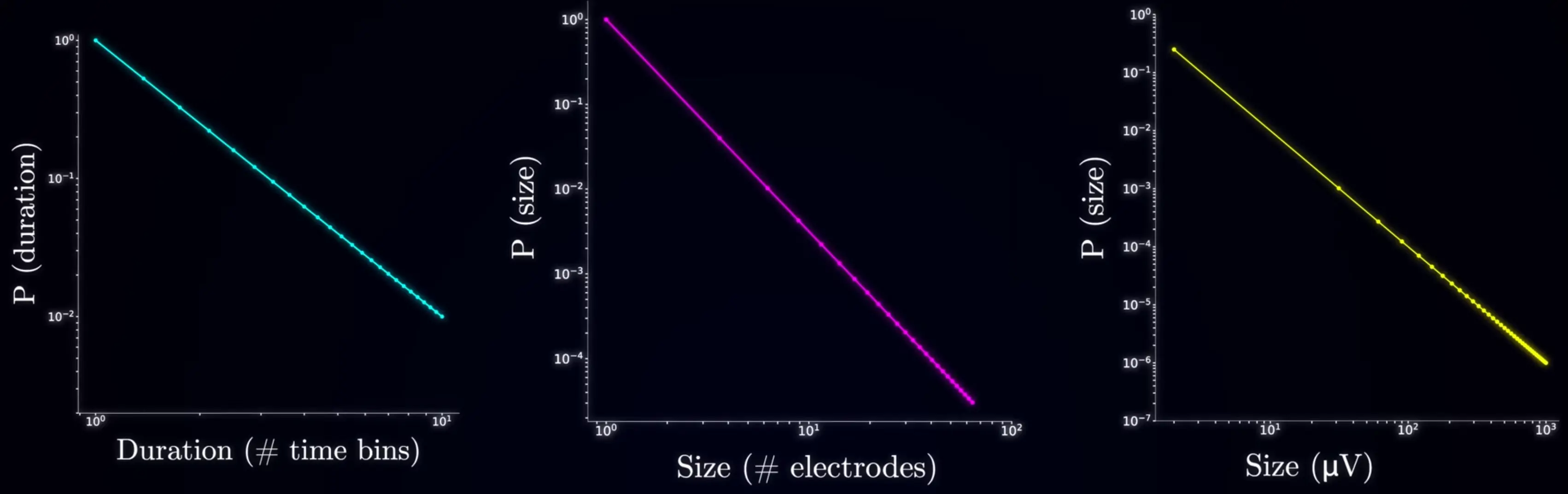Neuronal activity can be seen as avalanches of signals, with a certain size and duration and amplitude.