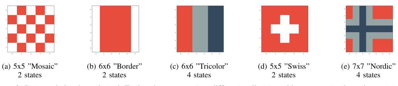 During development of the system, a variation of different configurations was tested for different problems. However, for the results included herein, a choice was made to use the same CPPN-NEAT configuration, and as close to the same CA configuration as possible for all problems. This makes it easier to make comparison between experiments, but also means that the settings chosen may favour some experiments over others. The optimisation of CPPN-NEAT parameters is outside the scope of this paper.