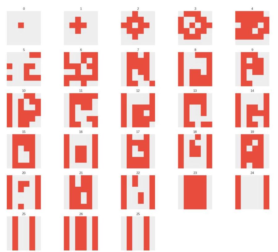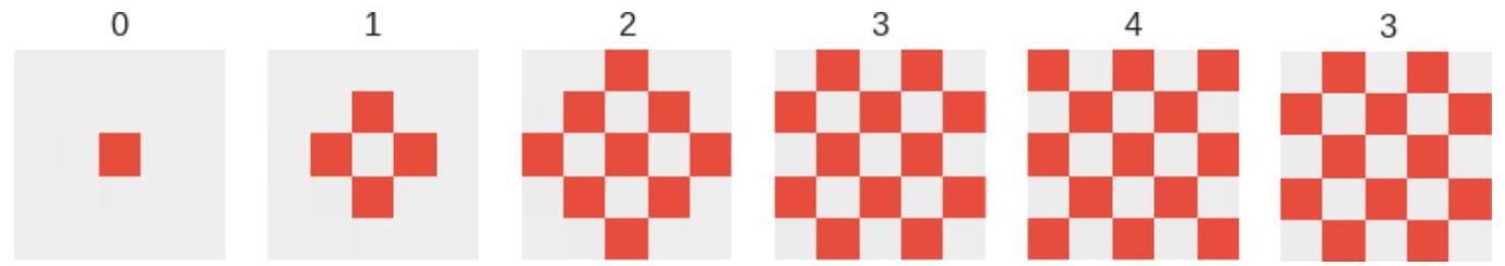 Figure A.5: The only solution that was found for the ”Border” morphogenesis. After finding the target state in iteration 23, the CA goes in to a two-step cycle which does not include the target state.