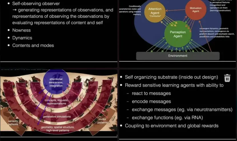 Bach also calls this “game engine” the perception agent. It is controlled by a motivation agent, which is guided by natural geometric features, but importantly assigns rewards to perceptual features and learns / constructs with their help, giving feedback to the attentional agent. The attentional agent conditionally parameterizes states and operations using indexed memory, orchestracting other parts of the mind, trying to maintain coherent behaviour.