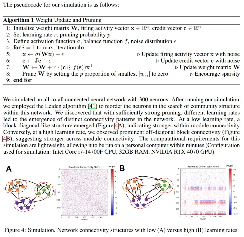 We note four key points about the set up of our simulation algorithm. First, for the purposes of this exploration, the simulation algorithm makes one simplifying assumption In the model dynamics, the input/output clamping signal is replaced with a random Gaussian noise term, ϵ. This substitution serves the dual purposes of eliminating the need for specific input-loss pairs from open task datasets, and preventing the system from being trapped indefinitely in a trivial state. Second, to ensure the existence of a non-trivial equilibrium states, the first 10% of the rows of the matrix J were fixed to be a diagonal matrix. This can be interpreted as output clamping for that initial 10% of neurons, thereby guaranteeing the existence of a non-trivial equilibrium state via clamping. Third, in the wiring of biological networks, pruning of weak synaptic connections, a mechanism of structural plasticity, co-occurs with classical mechanisms of synaptic plasticity. Therefore, for the purposes of our exploration of neural connectivity structures, we pair our new synaptic plasticity rule with pruning. This encourages sparsity and the emergence of structured patterns of connectivity. Finally, a learning rate factor, r, is added to Equation 4, which serves as a key free parameter of interest.