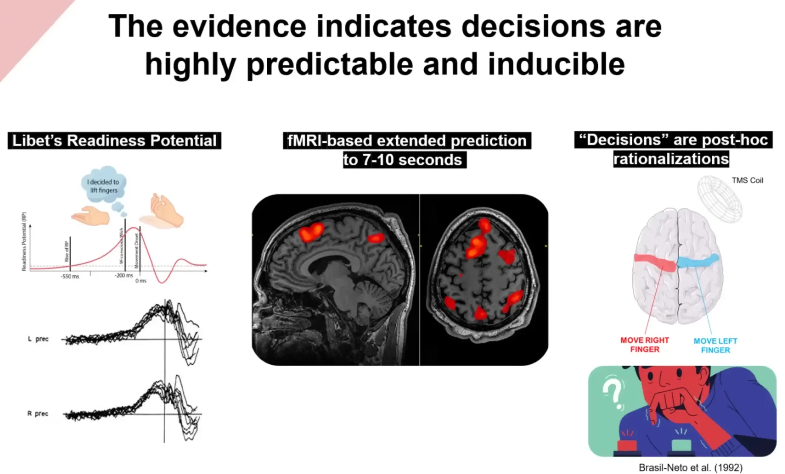 Decisions seem to be made subconsciously, highly predictable and inducible. What we experience as decisions are post-hoc rationalizations.