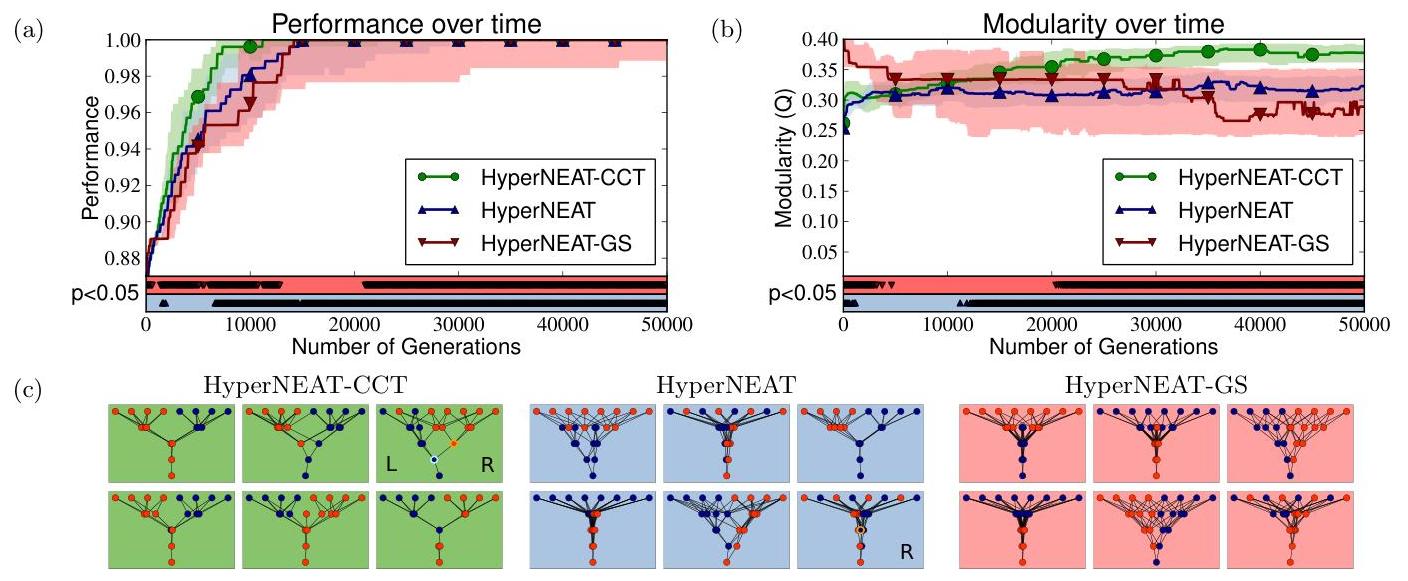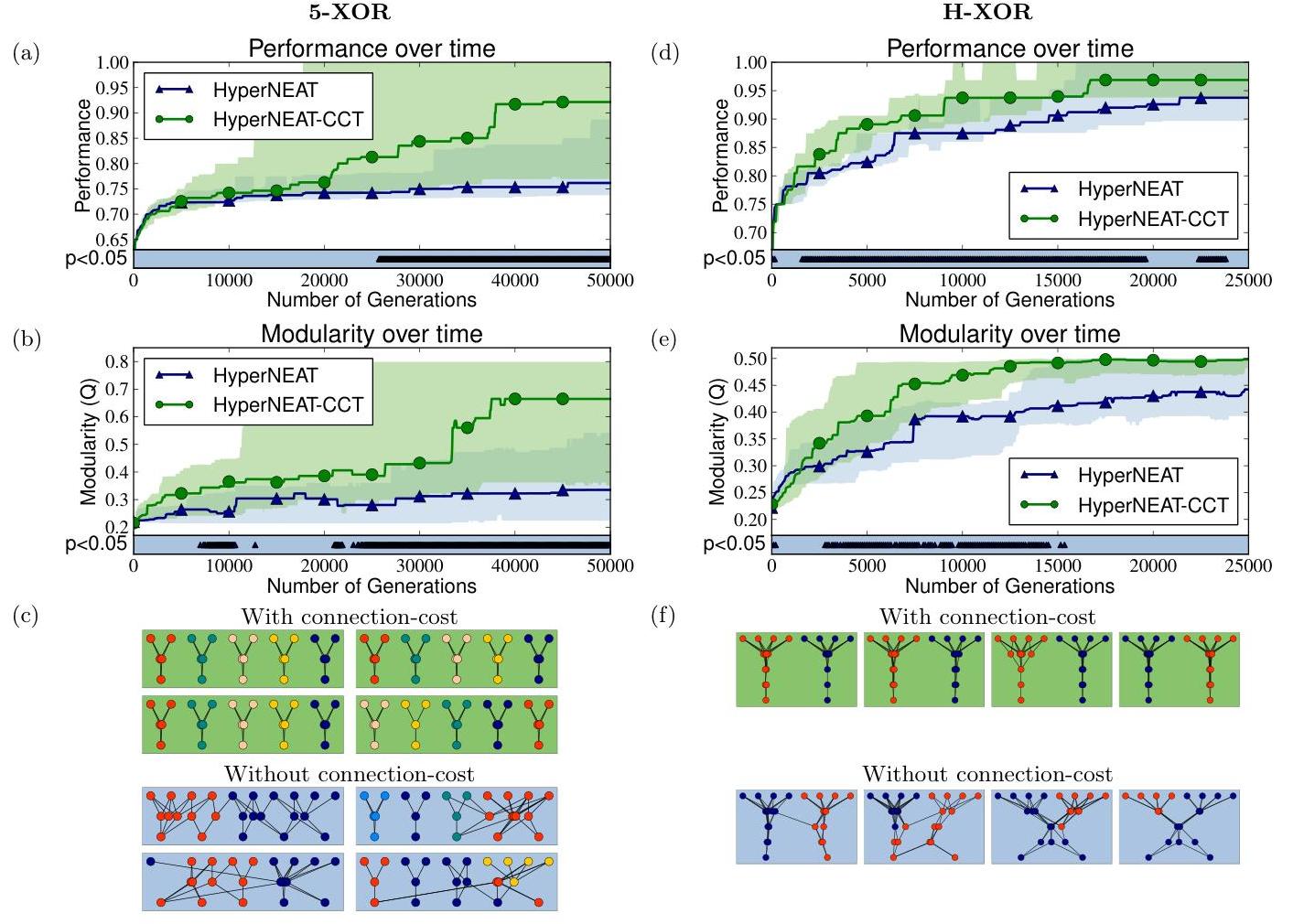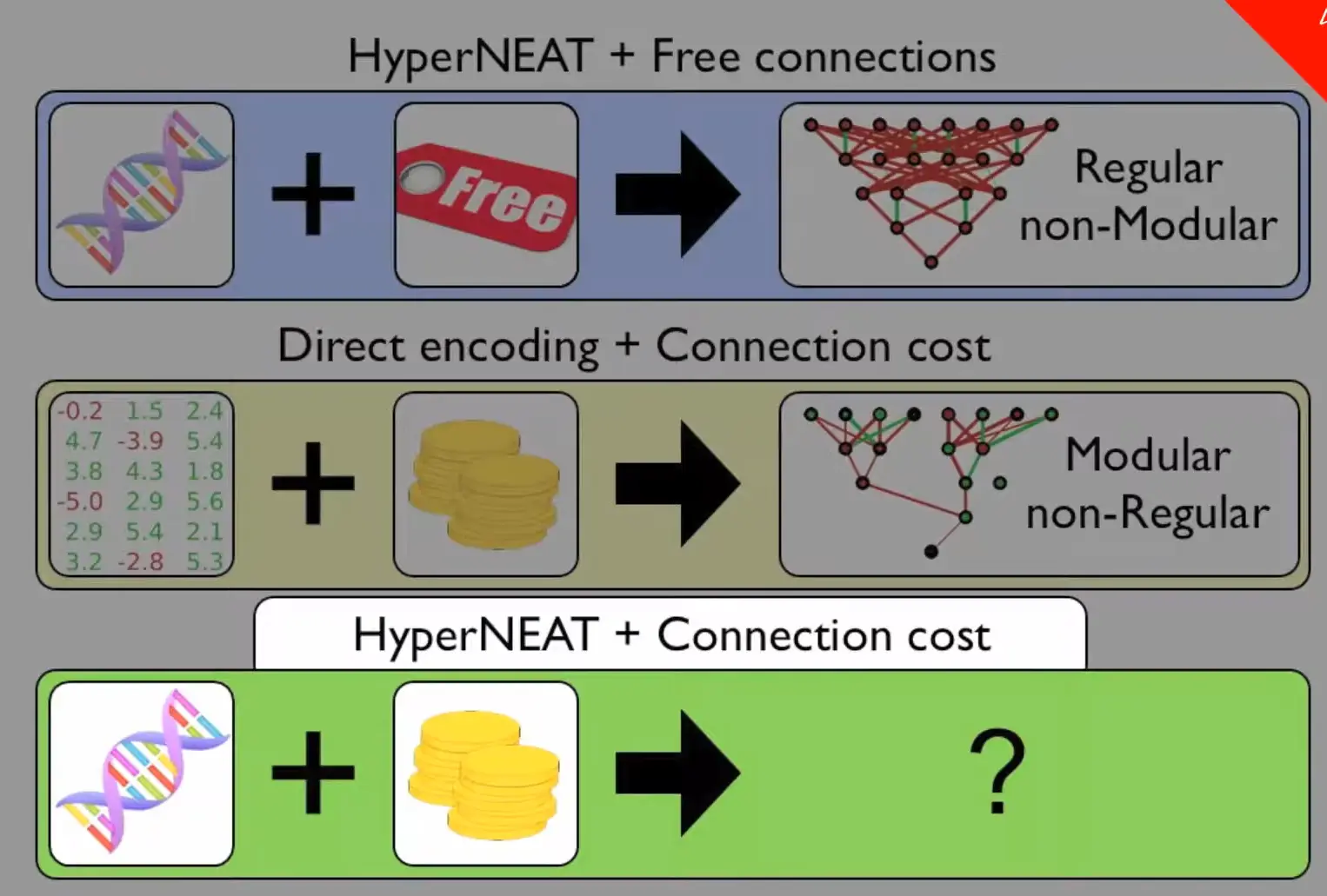 paper: https://www.researchgate.net/publication/262013945_Evolving_Neural_Networks_That_Are_Both_Modular_and_Regular_HyperNeat_Plus_the_Connection_Cost_Technique