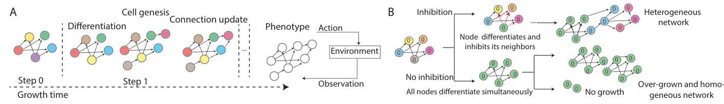If all cells make the same local decisions, the network becomes homogeneous and cannot express complex control policies. The aim is to study a developmental approach that grows both topology and weights while keeping enough heterogeneity to avoid this collapse.