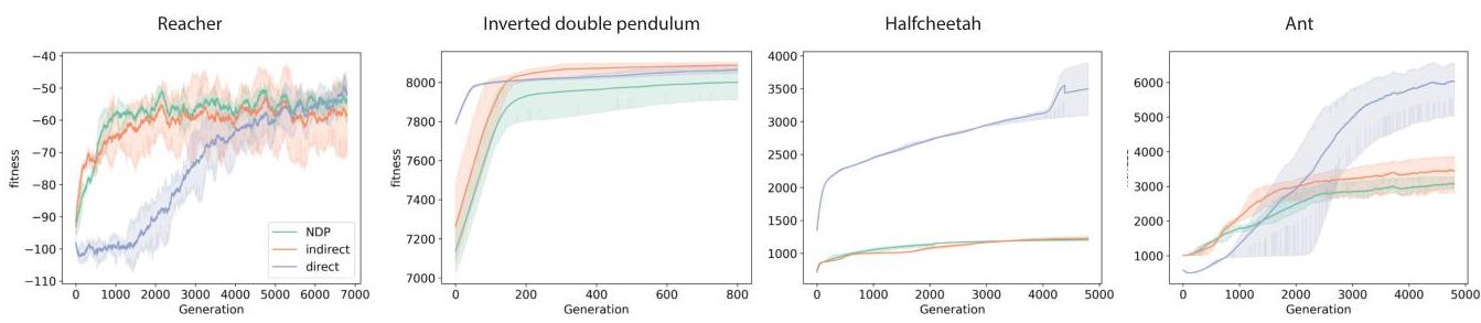 ↩The direct encoding is provided as a baseline that is known to perform well in the tasks we examine and, therefore, serves as an expected upper threshold for fitnesses. As these tasks do not pose any particular need for generalisation or robustness we do not expect to see indirect encodings outcompeting direct ones.