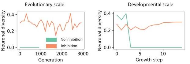 - Inhibition increases measured diversity both across evolutionary time (final networks per generation) and across developmental time (within a growth rollout).