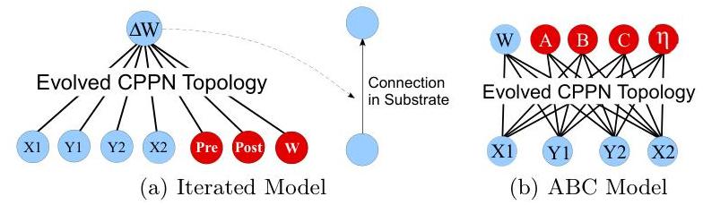 In the most general iterated model, they augment HyperNEAT with pre- and post-synaptic activation, and with the weight value, and have it output a delta to the weight value. At the initial step pre,post and w are set to 0, and the conenctivity is initialized like in HyperNEAT, but the network is also queried every subsequent timestep.