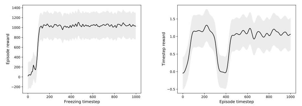 Left: The cumulative reward for the quadruped whose weights are frozen at different timesteps. The Hebbian network only needs in the order of 30–80 timesteps to converge to high-performing weights. Right: The performance of a quadruped whose actuators are frozen (saturating all its outputs to 1.0) during 100 timesteps (from t=300 to t=400). The robot is able to quickly recover from this perturbation in around 50 timesteps.