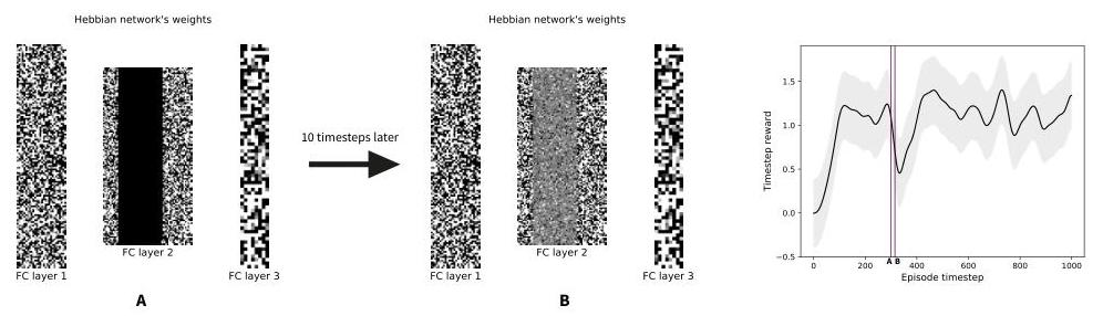 Resilience to weights perturbations. A: Visualisation of the network’s weights at the timestep when a third of its weights are zeroed out, shown as a black band. B: Visualisation of the network’s weights 10 timesteps after the zeroing; the network’s weights recovered from the perturbation. Right: Performance of the quadruped when we zero out a subset of the synaptic weights quickly recovers after an initial drop. The purple line indicates the timestep of the weight zeroing.