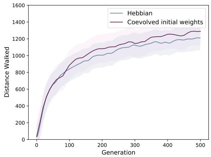 initializing the network with random weights at each episode and co-evolving the initial weights lead to similar results. Curves are averaged over three evolutionary runs.