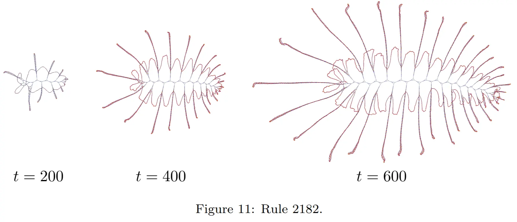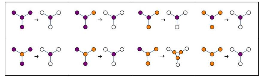 Read the figure from left to right top to bottom, with the rules in pairs: 00000010 … there’s only one configuration where division occurs 11111101 … there’s only one configuration where a node dies