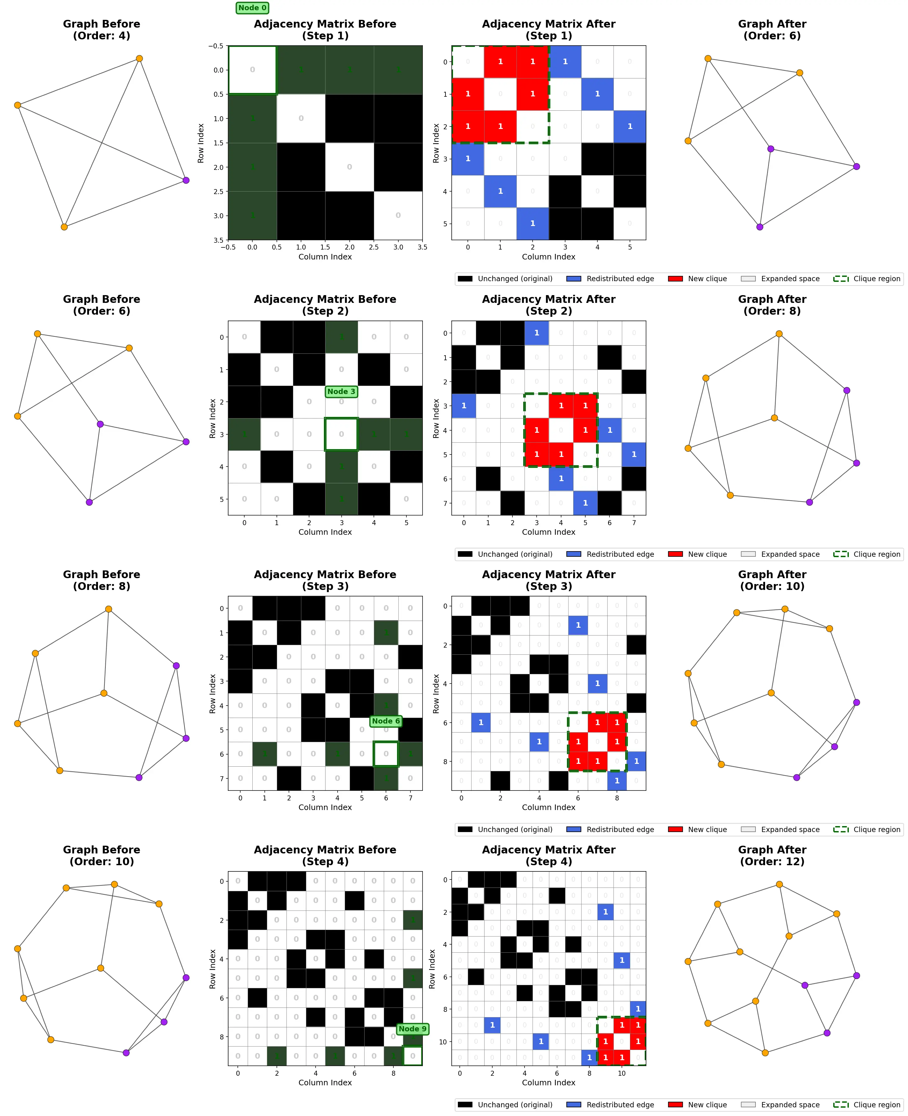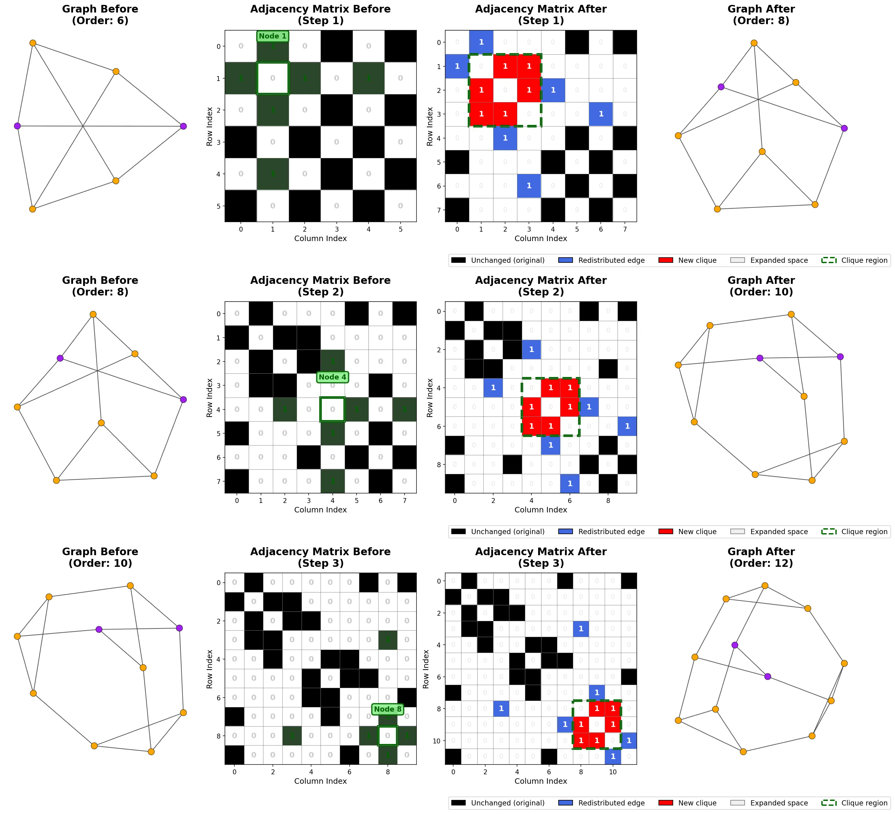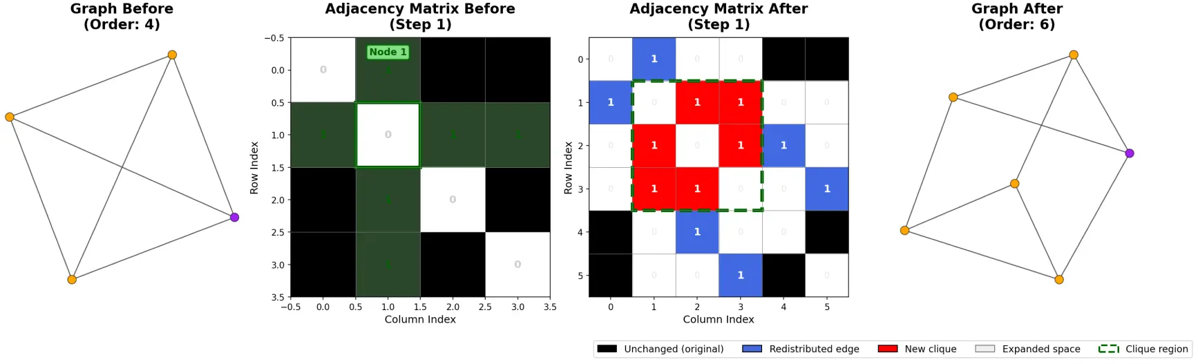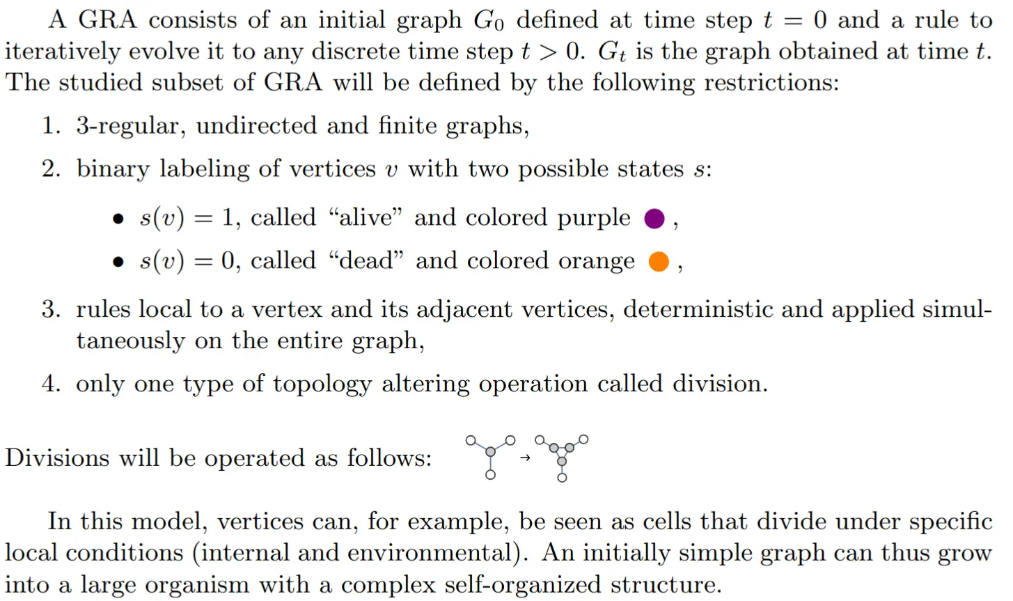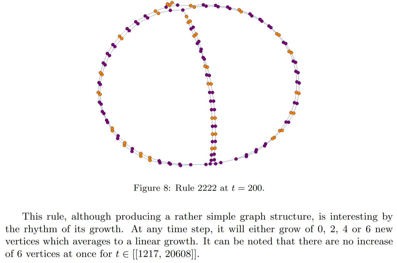 @dataclass(frozen=True)class Graph: adjacency: sparse.BCOO state: jnp.ndarray @dataclass(frozen=True) class Rule: number: int degree: int = 3 def __post_init__(self) -> None: assert self.degree > 0 assert 0 <= self.number < 4 ** (2 * (self.degree + 1)) @cached_property def binary(self) -> jnp.ndarray: rule = list(map(int, np.binary_repr(self.number))) rule += [0] * (4 * (self.degree + 1) - len(rule)) return jnp.array(rule[::-1], dtype=jnp.int32) @cached_property def binary_lsb(self) -> jnp.ndarray: return self.binary[::-1] def __repr__(self) -> str: return f"Rule(degree={self.degree}, number={self.number}, binary={''.join(map(str, self.binary.tolist()))})" def __call__(self, g: Graph) -> Graph: new_state, division_vector = apply_rule_without_division(self, g.adjacency, g.state, self.binary_lsb) C = (rule.degree + 1) * g.state + g.adjacency @ g.state new_state = self.binary_lsb[C] division_vector = self.binary_lsb[C + 2 * (rule.degree + 1)] div_indicies = jnp.where(division_vector != 0)[0] current_adjacency, current_states = g.adjacency, new_state for i, idx in enumerate(div_indicies): idx += i * (self.degree - 1) # net addition of two nodes current_adjacency, current_states = divide(current_adjacency, current_states, idx, self.degree) return Graph(current_adjacency, current_states, d=self.degree) def divide(adjacency: sparse.BCOO, states: jnp.ndarray, div_idx, degree: int): n = adjacency.shape[0] new_size = n + degree - 1 # replace state of div_idx with degree copies of itself new_states = jnp.concatenate([states[:div_idx], jnp.full((degree, 1), states[div_idx]), states[div_idx + 1 :]]) (rows, cols), data = adjacency.indices.T, adjacency.data neighbours = rows[cols == div_idx] neighbours = jnp.sort(neighbours) # consistent ordering # remove edges connected to div_idx mask = (rows != div_idx) & (cols != div_idx) rows, cols, data = rows[mask], cols[mask], data[mask] # shift indices greater than div_idx by degree - 1 to account for new nodes rows = jnp.where(rows > div_idx, rows + degree - 1, rows) cols = jnp.where(cols > div_idx, cols + degree - 1, cols) neighbours = jnp.where(neighbours > div_idx, neighbours + degree - 1, neighbours) # add clique of new nodes clique_rows = jnp.repeat(jnp.arange(div_idx, div_idx + degree), degree) clique_cols = jnp.tile(jnp.arange(div_idx, div_idx + degree), degree) clique_mask = clique_rows != clique_cols clique_rows, clique_cols = clique_rows[clique_mask], clique_cols[clique_mask] clique_data = jnp.ones_like(clique_rows, dtype=jnp.int32) # redistribute neighbours sequentially, connecting each of the original neighbours to one of the new nodes connect_rows = neighbours connect_cols = div_idx + jnp.arange(degree) connect_data = jnp.ones_like(connect_rows, dtype=jnp.int32) # combine all # symmetric adjacency all_rows = jnp.concatenate([rows, clique_rows, connect_rows, connect_cols]) all_cols = jnp.concatenate([cols, clique_cols, connect_cols, connect_rows]) all_data = jnp.concatenate([data, clique_data, connect_data, connect_data]) new_adjacency = sparse.BCOO((all_data, jnp.stack([all_rows, all_cols], axis=1)), shape=(new_size, new_size)) return new_adjacency, new_states ```
