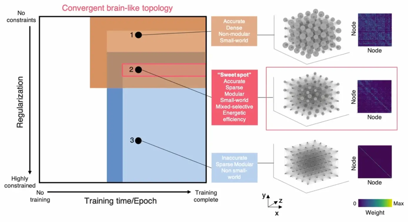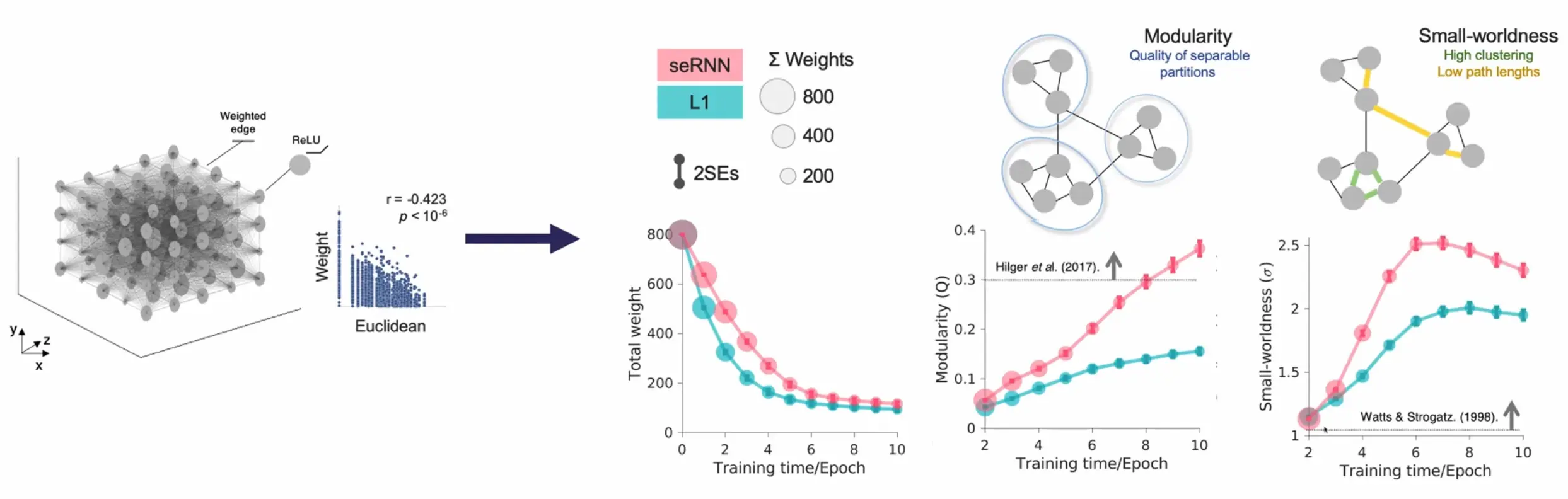 Spatially-embedded Recurrent Neural Networks (seRNNs) link structural and functional neuroscience by simultaneously optimizing networks for task performance while constraining them to exist in 3D space with “metabolic costs.” This joint optimization causes diverse brain-like features—modularity, small-worldness, functional clustering, mixed selectivity, and energy efficiency —to emerge together in a “sweet spot” of the parameter space.