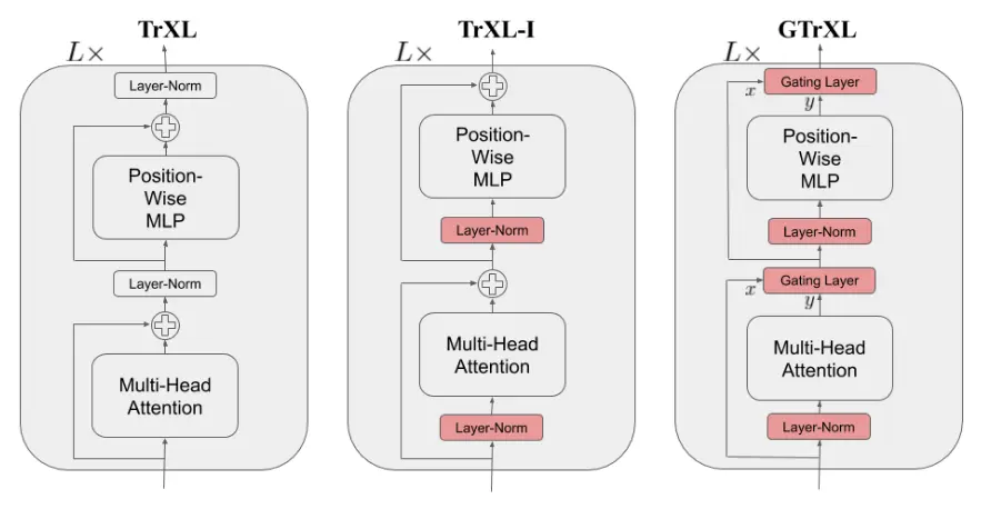 Adds gating mechanism to Transformer-XL + uses PreNorm, which stabilizes training in RL settings: