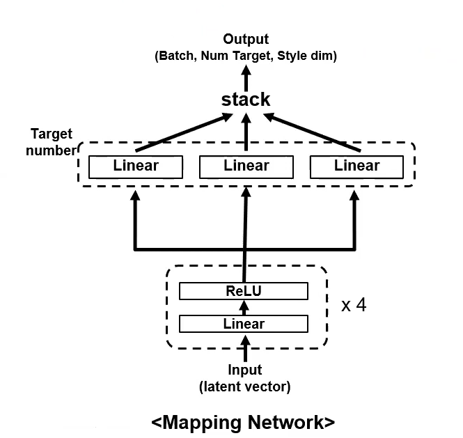The mapping netowrk can be used to create the style vector instead of a style by reference mel-spectrogram from the Style Encoder. We sample from a random gaussian distribution.