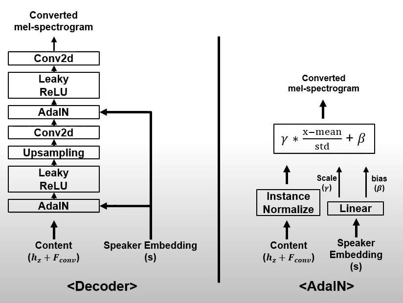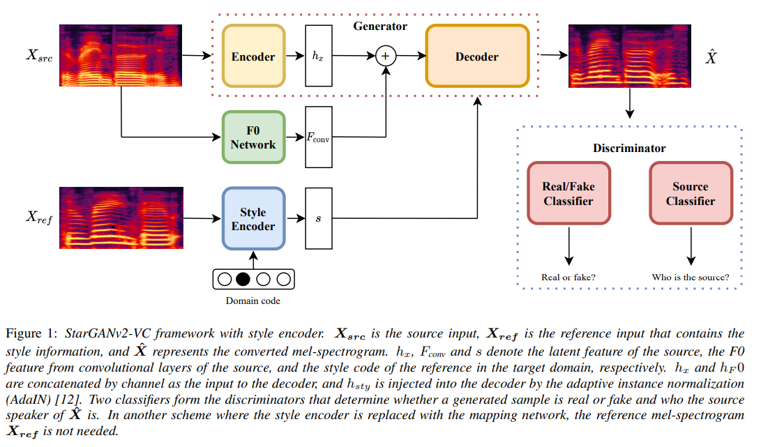 The generator takes an input mel-spectrogram and a style vector and learns to generate a new mel-spectrogram via the adversarial loss.