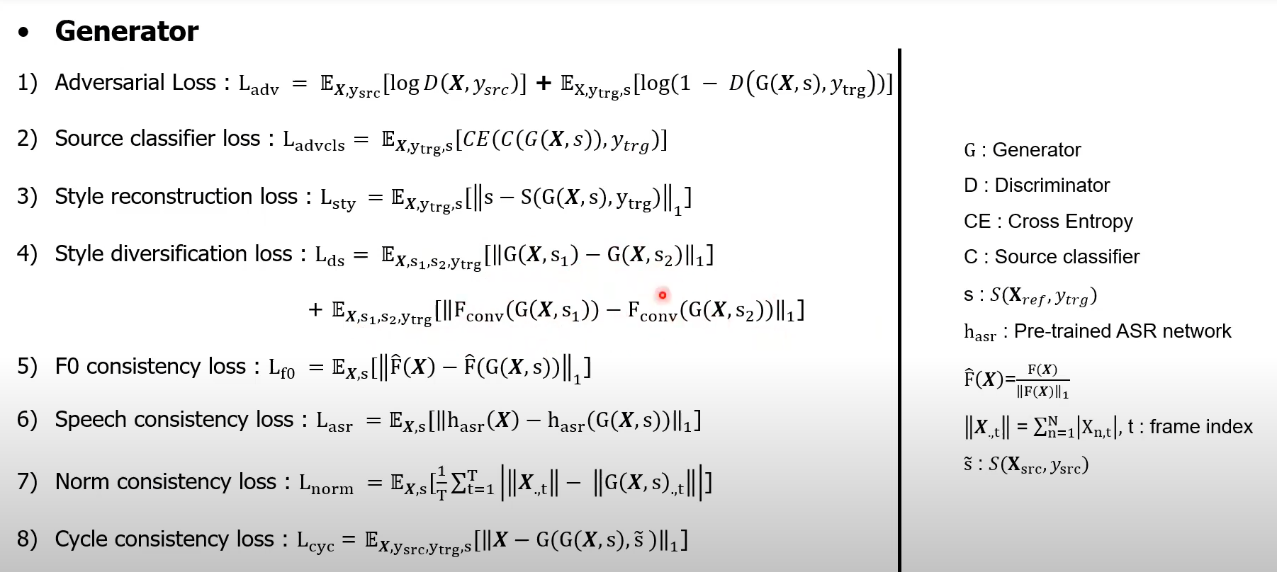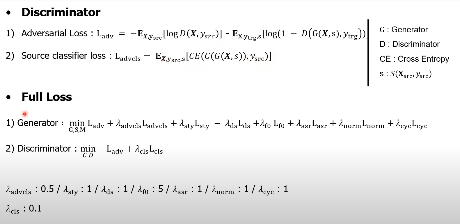 During the training, we sample a target domain and a style code randomly via either mapping network where with a latent code , or style encoder where with a reference input . Given a mel-spectogram , the source domain and the target domain , we train our model with the following loss functions: