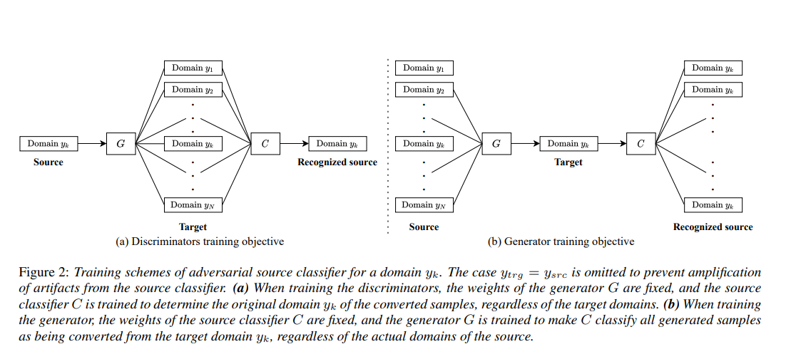 Training schemes of adversarial source classifier for a domain . The case is omitted to prevent amplification of artifacts from the source classifier. (a) When training the discriminators, the weights of the generator are fixed, and the source classifier is trained to determine the original domain yk of the converted samples, regardless of the target domains. (b) When training the generator, the weights of the source classifier are fixed, and the generator is trained to make classify all generated samples as being converted from the target domain , regardless of the actual domains of the source.