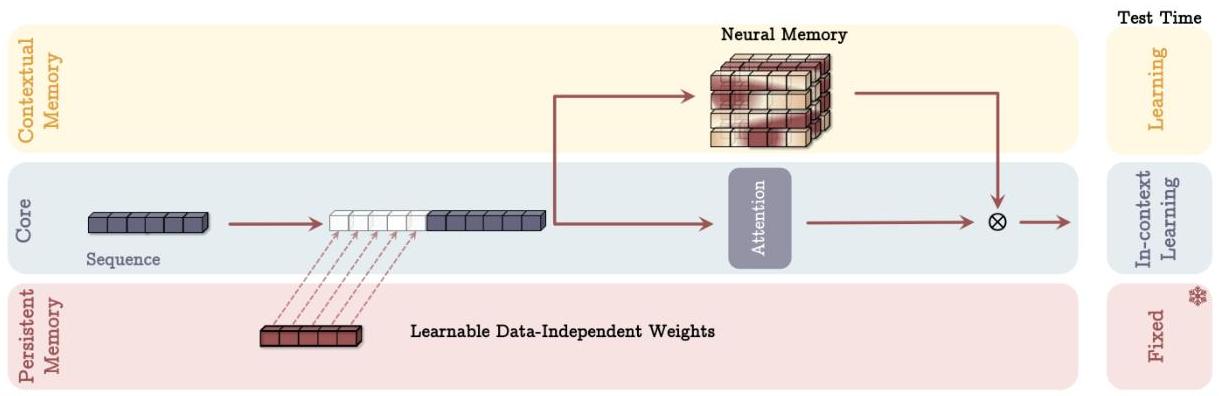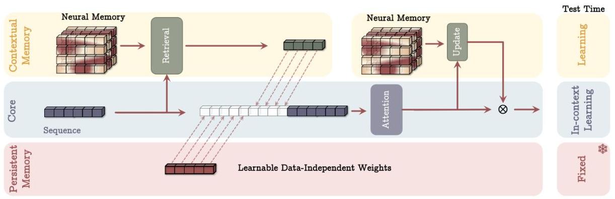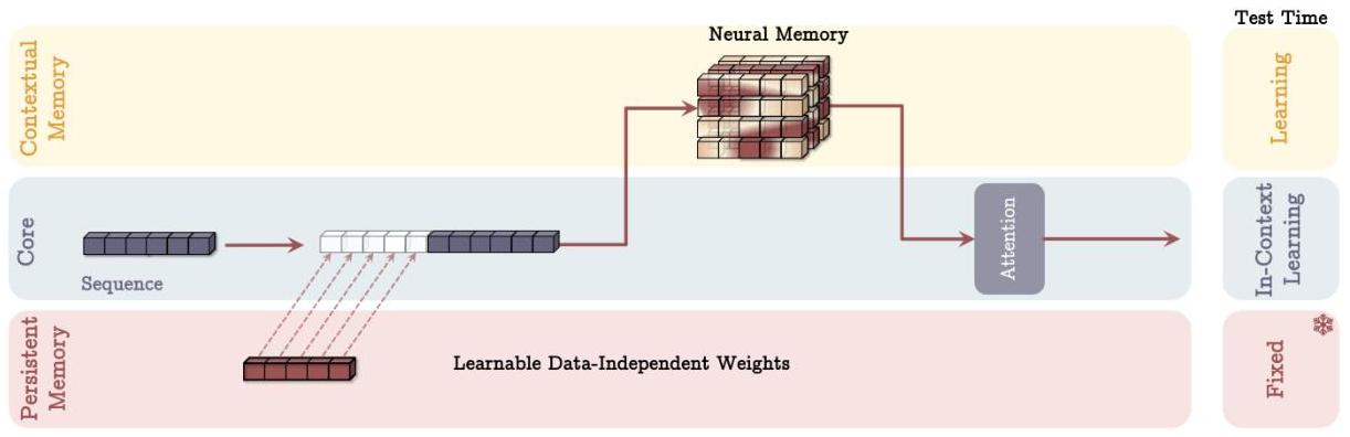 This architecture includes three branches of (1) core, (2) contextual (long-term) memory, and (3) persistent memory. The core branch concatenates the corresponding long-term and persistent memories with the input sequence. Next, attention performs on the sequence and decides what part of the information should store in the long-term memory. At the test time, parameters corresponds to contextual memory are still learning, parameters corresponds to the core branch are responsible for in-context learning, and parameters of persistent memory are responsible to store the knowledge about tasks and so are fixed.