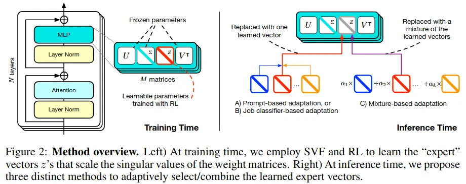 Expert Training: For each task, they train a separate expert vector z using SVF and REINFORCE: