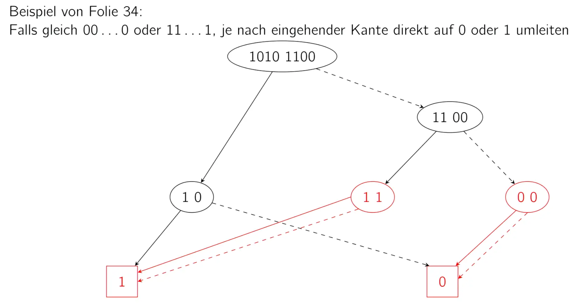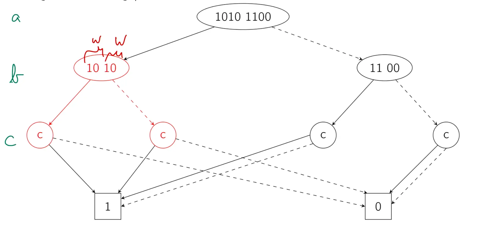 If the two words are the same in the tree, we can merge. If they contain only 1s or only 0s, we collapse it to pointing to only 1 or 0.