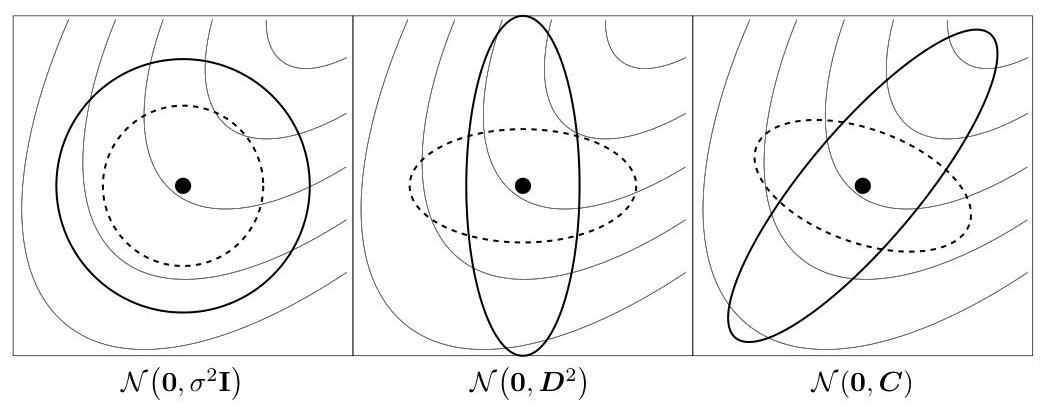But that alone is not enough. This way alone the distribution gets stretched very thin in the direction of the elites, and the size of the distribution shrinks quickly, because if the distribution is a long ellipse, the new population will be spread out along that axis too, and if it shrinks, the elite will be closer to the mean, the distribution shrinks even more, …