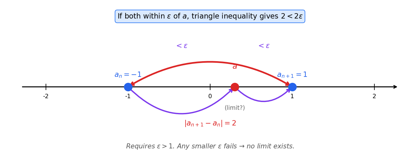 The definition demands: for any (no matter how small), eventually the sequence stays within that -ball forever. This is stricter than boundedness. A sequence can be bounded yet divergent if it keeps jumping around.