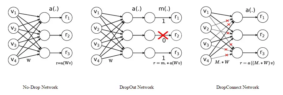 DropConnect is a regularization technique where each weight+bias has a probability of being .