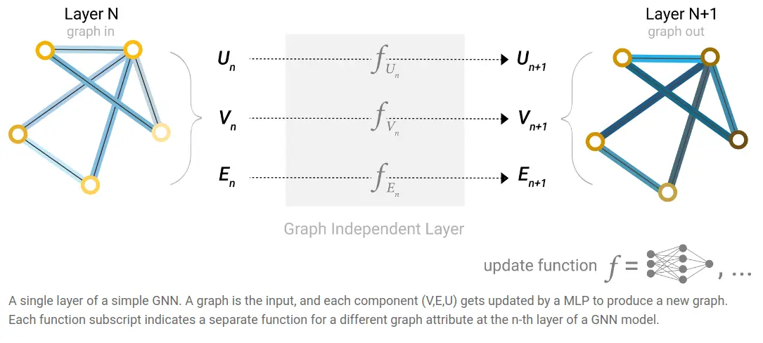 Here, the output has the same structure - described by the same adjacency list - so the node / edge / global feature vectors get replaced by learned embeddings.