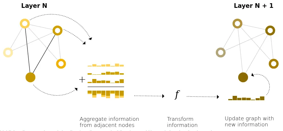 Link to originalA simple type of “message passing” in GNNs is simply aggregating information from adjacent nodes to compute the next embedding for a node (in conjunction with the nodes own embedding).