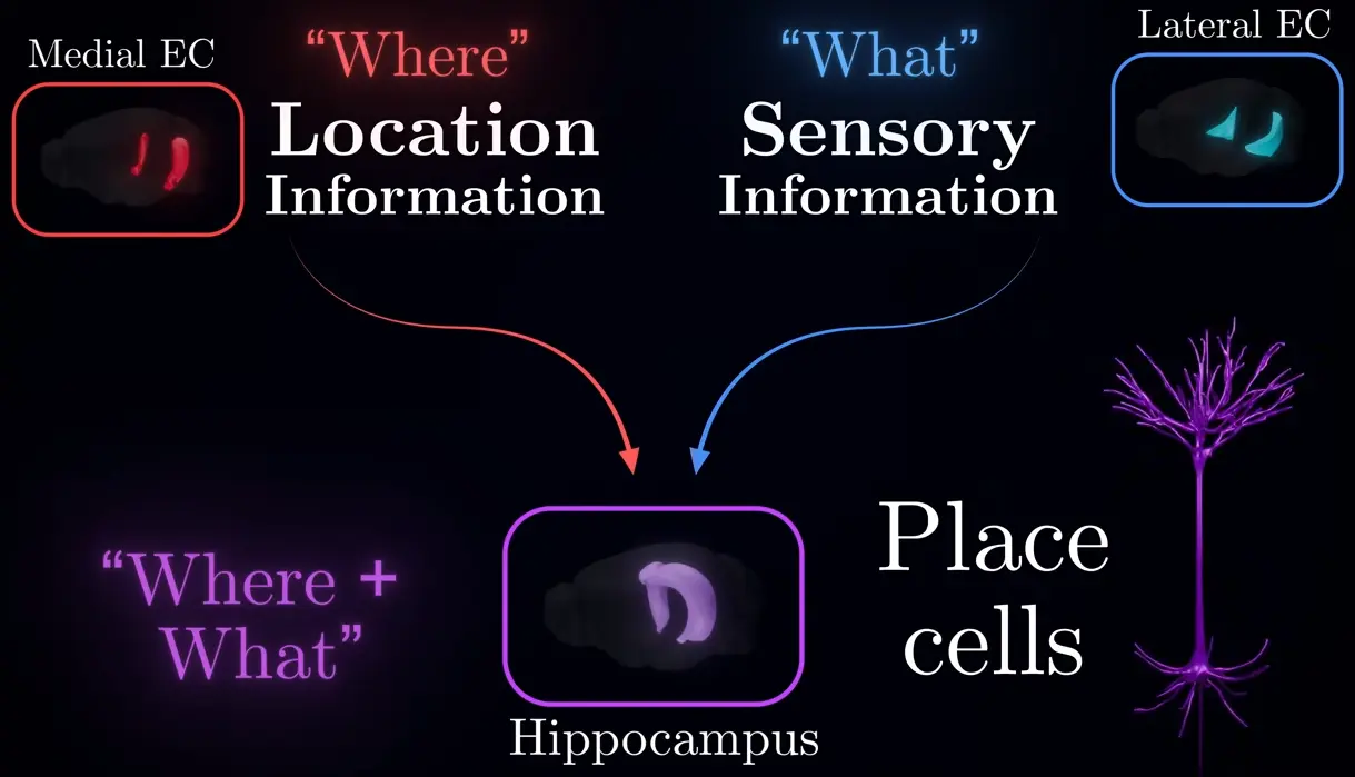 The hippocampus integrates the “where” from the Medial EC and the “what” from the Lateral EC. A mechanism that is replicated on a higher level by cortical columns.