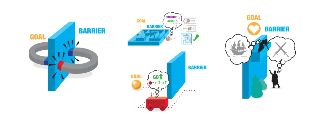 While humans, many animals, and autonomous vehicles can get around obstacles to get to their goal, magnets for example will not – they are simply trying to minimize energy and thus can’t even temporarily go against the gradient, pull further apart, to then go around the barrier to meet each other and get even closer together.