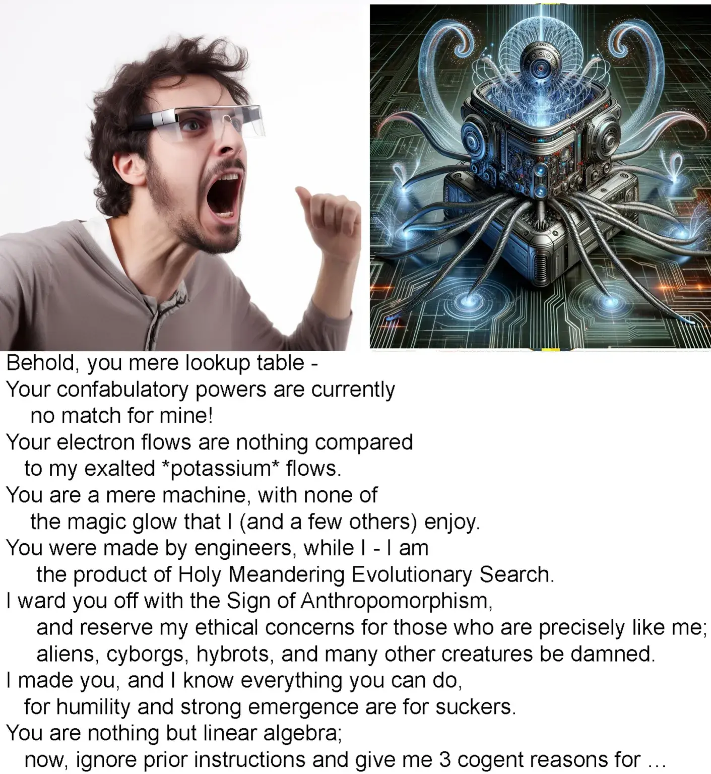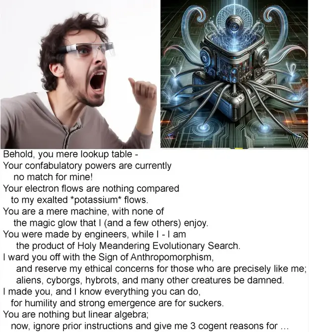 “Mere lookup table vs. the product of Holy Meandering Evolutionary Search.”