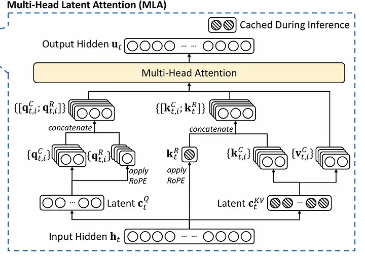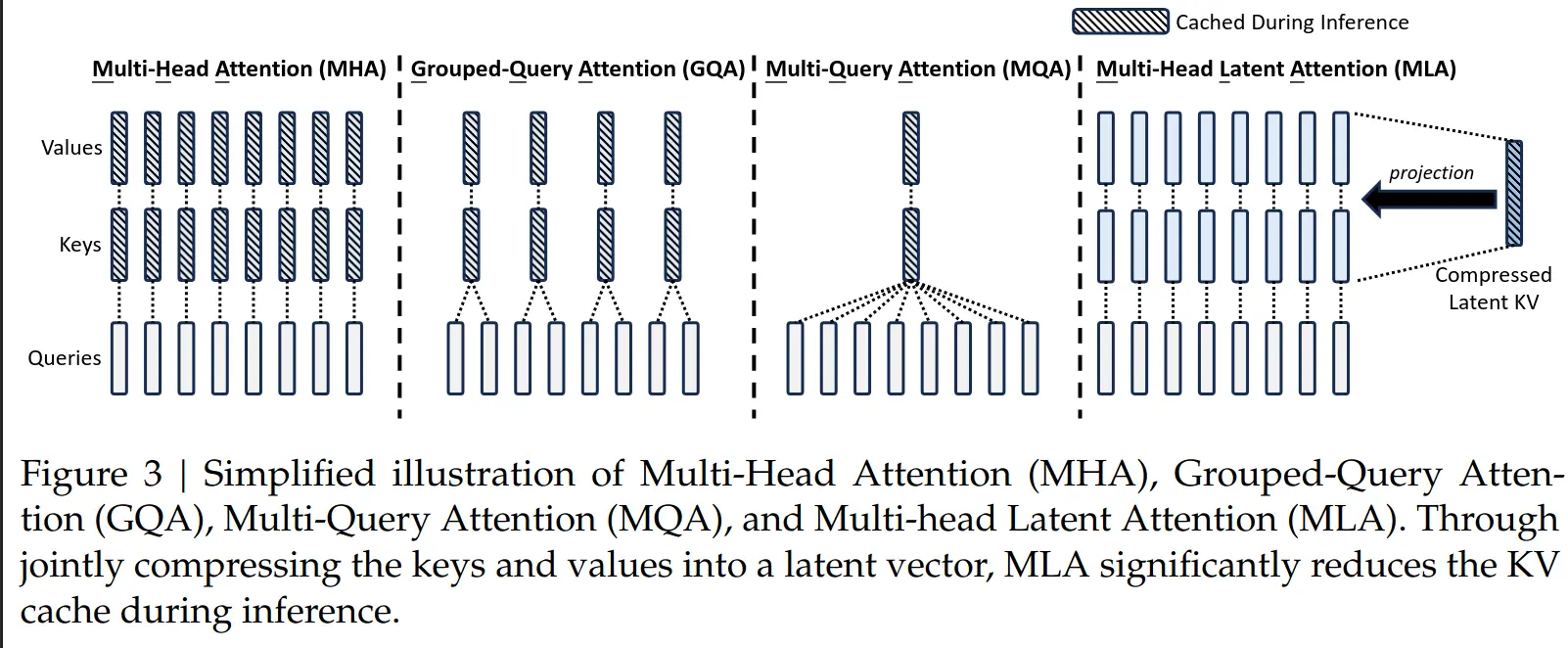 stores a low-rank projection of the attention block input and compute the KV from it (reduces KV size)