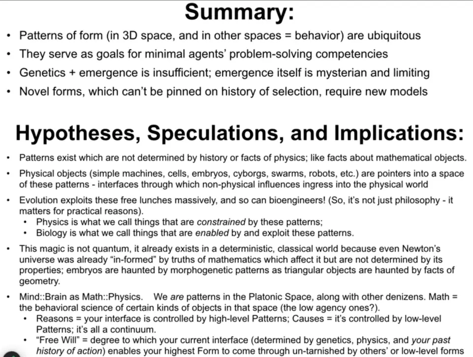 There is such a space not just for mathematics, but also for kinds of minds, and life is good at exploiting it. This is not a random space, where interesting / useful emergent properties just so pop up from time to time, but it’s structured, it is incredibly vast, and we should map it, otherwise we just end up with a grab-bag, a catalog of things that hold. We need to assume there is a causal structure to it.