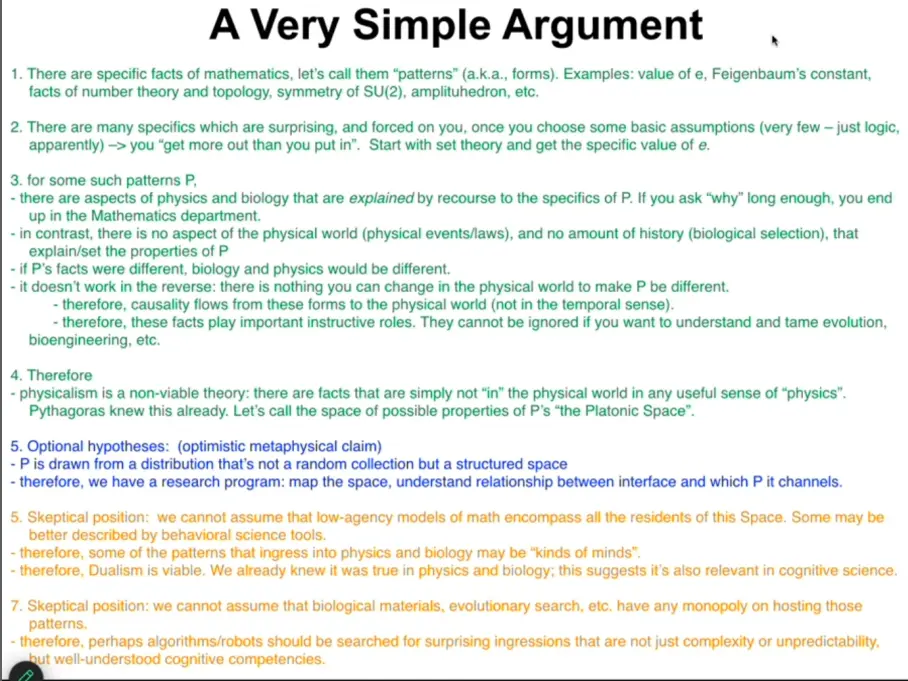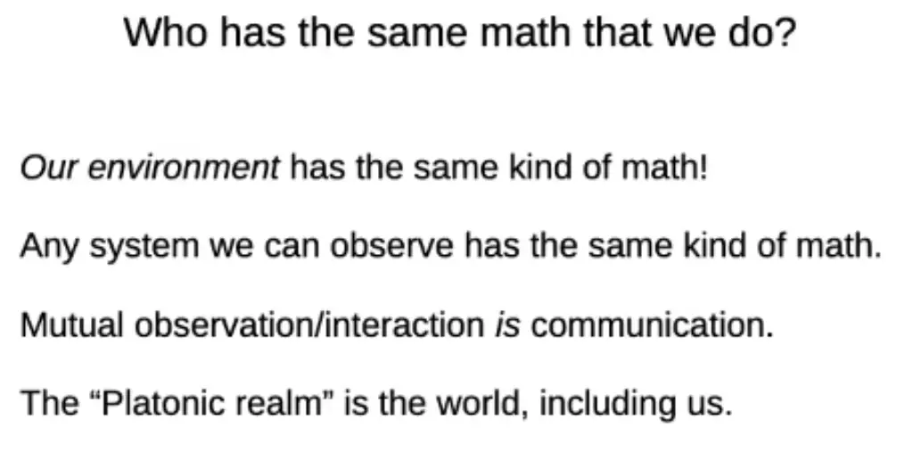 What empirical predictions can we make with a separate “realm” that we can’t without it?I think Levin stands things on their head in points 3) and 4) of his argument: Mathematical facts don’t act on the world, they’re abstracted from it by minds modeling regularities.