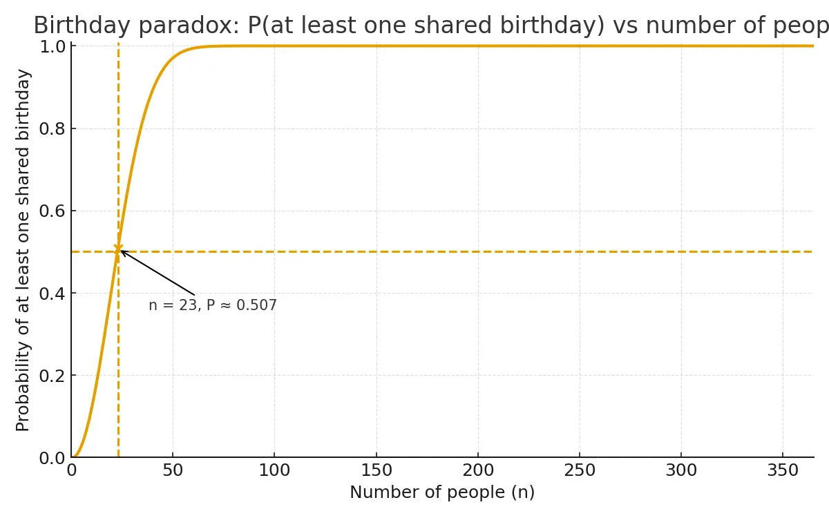 If there are n people in a room, how large does n need to be for at least 50% chance of at least 2 people sharing a birthday?