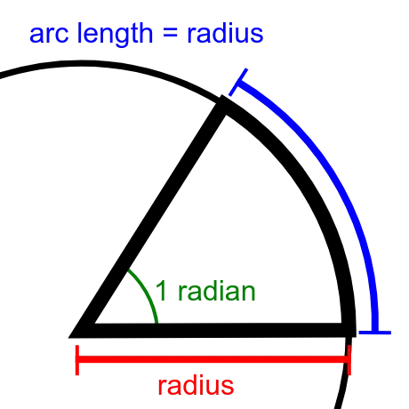 One radian is the angle created when the arc length (i.e. a distance along the circle) is equal to the radius of the circle.