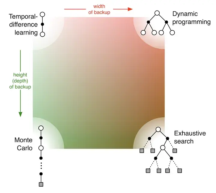 The picture shows the value propagation (“backup”) of a single update step with these three methods: