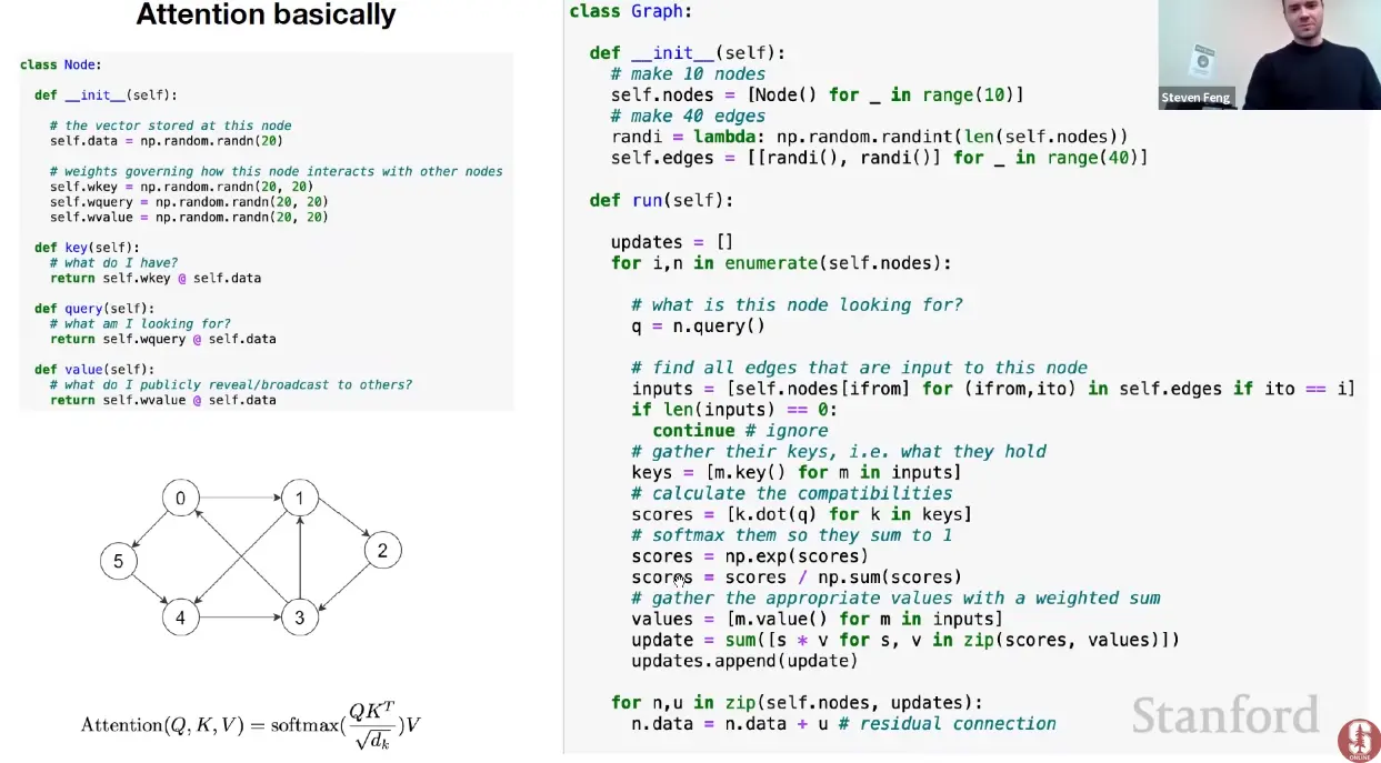 Every node (token) has some vector of information (R1×d) at each point in time (data-dependent) and it gets to aggregate information via a weighted sum from all the nodes that point to it.
