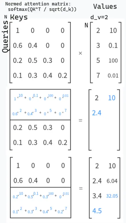 The resulting output values zt∈R1×dv are a weighted sum of the values that each token encodes. Tokens with large κ(qt,kτ) contribute more to the output zt.