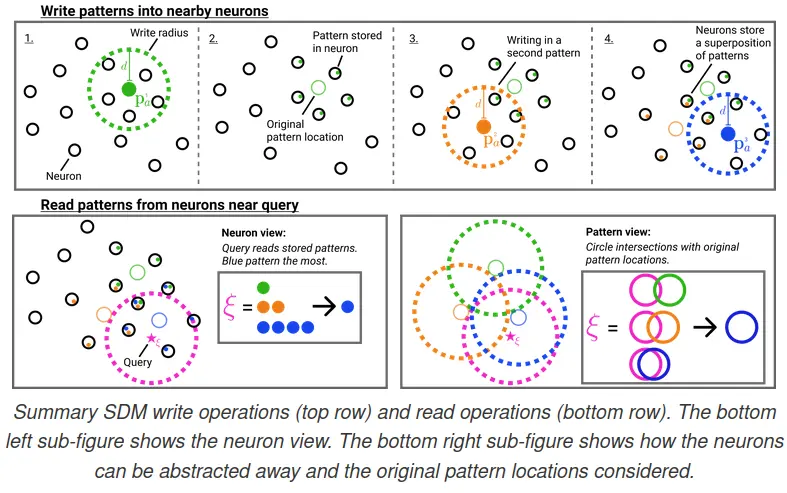 SDM for continual learning: Uses SDM principles (sparse, high-dimensional representations with localized writes) to build MLPs that avoid catastrophic forgetting. Inspired by cerebellar architecture. The sparse activation pattern means new learning doesn’t overwrite old memories as much.