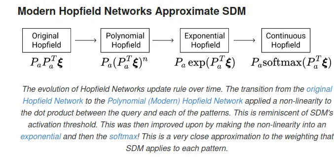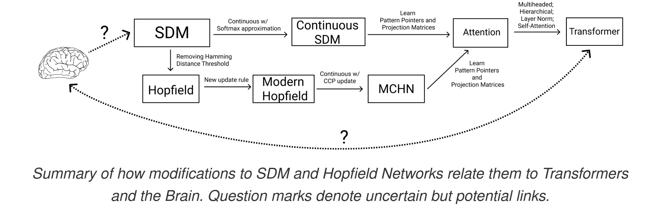 Attention ≈ Sparse Distributed Memory (SDM): Shows that transformer attention is mathematically equivalent to Kanerva’s SDM — a neuroscience-inspired associative memory model from the 1980s. The softmax attention weights approximate the “circle intersection” weighting that SDM uses. This gives a biologically plausible story for why attention works.