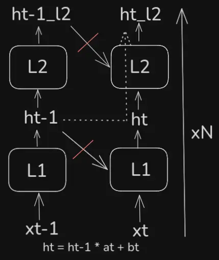 If such dependence is necessary, one can stack layers of SSMs, where the hidden state of each layer still can’t have any knowledge of the previous hidden states of the same layer, but can have knowledge of the hidden states of the previous layer - then layers have to be processed sequentially, but the sequence elements (which are usually much more) can still be processed in parallel. This way, information about the past is implicitly passed via the hidden state, which is computed as , where are the weights and biases of the layer at time .