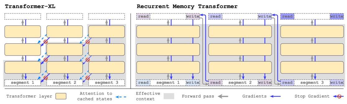 TLDR: Processing long input sequences as segments, where the newest is processed in parallel, and the past segments’ keys and values are cached (and cross-attend to them from the new segment). 1