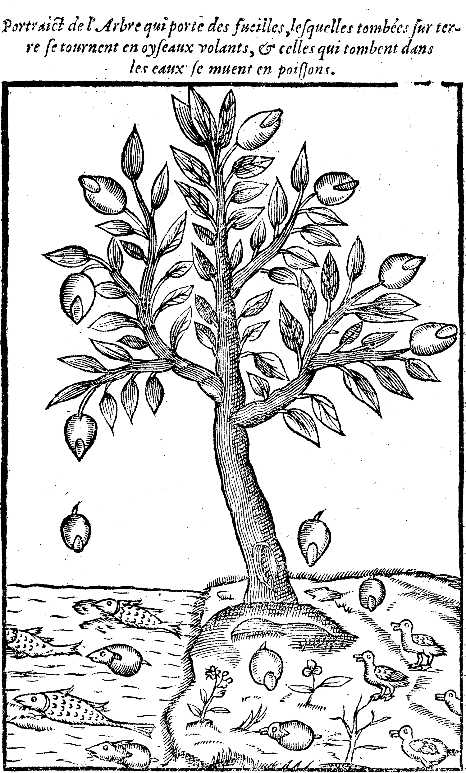 Spontaneous generation of birds and fish by a tree, depending on where its seeds land; Claude Duret, Histoire admirable des plantes et herbes esmerueillables et miraculeuses en nature, 1605