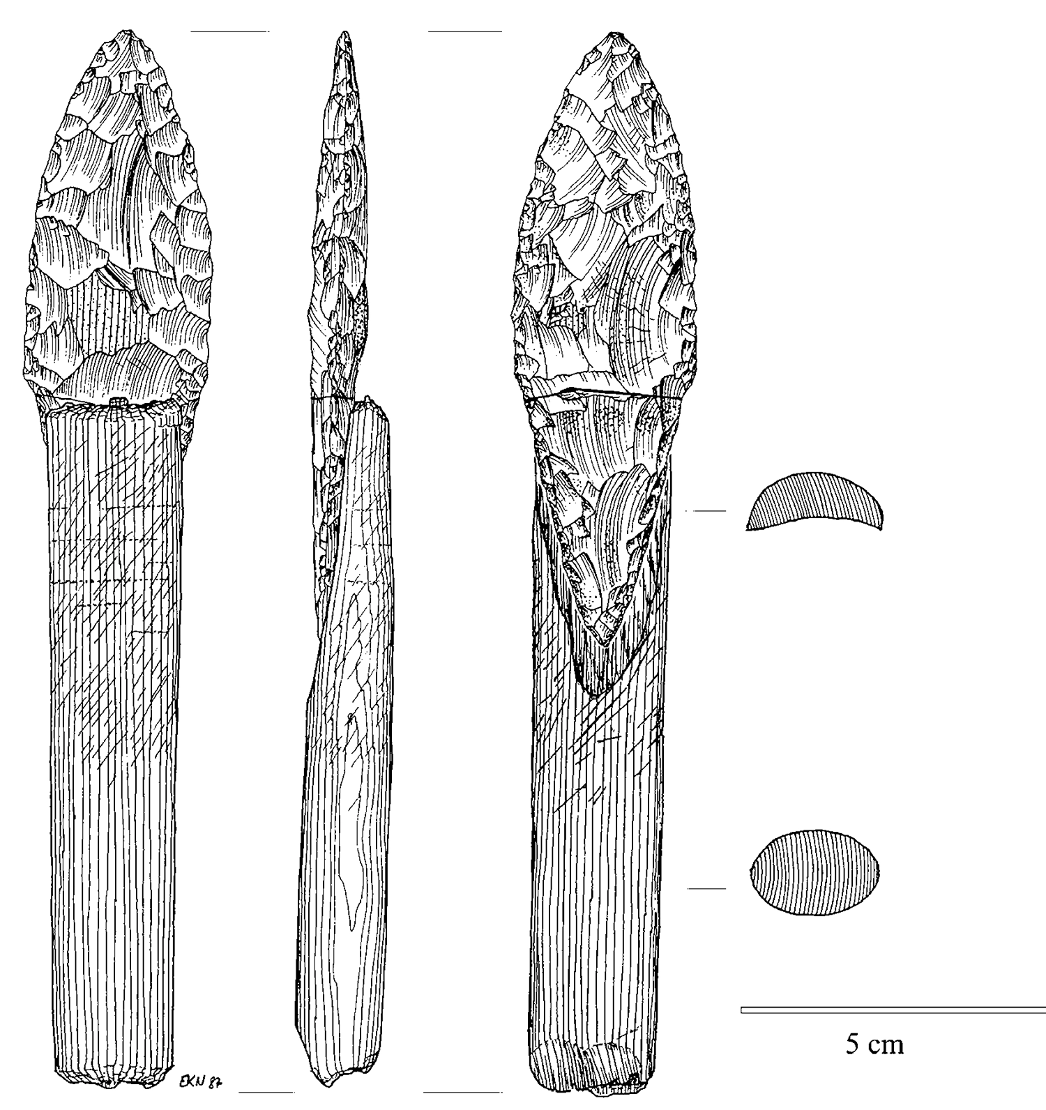 Hafted spear point from the mid-Holocene Arctic Small Tool site of Qeqertasussuk, West Greenland. Drawn by Eva Koch, reproduced with permission of Bjarne Grønnow.