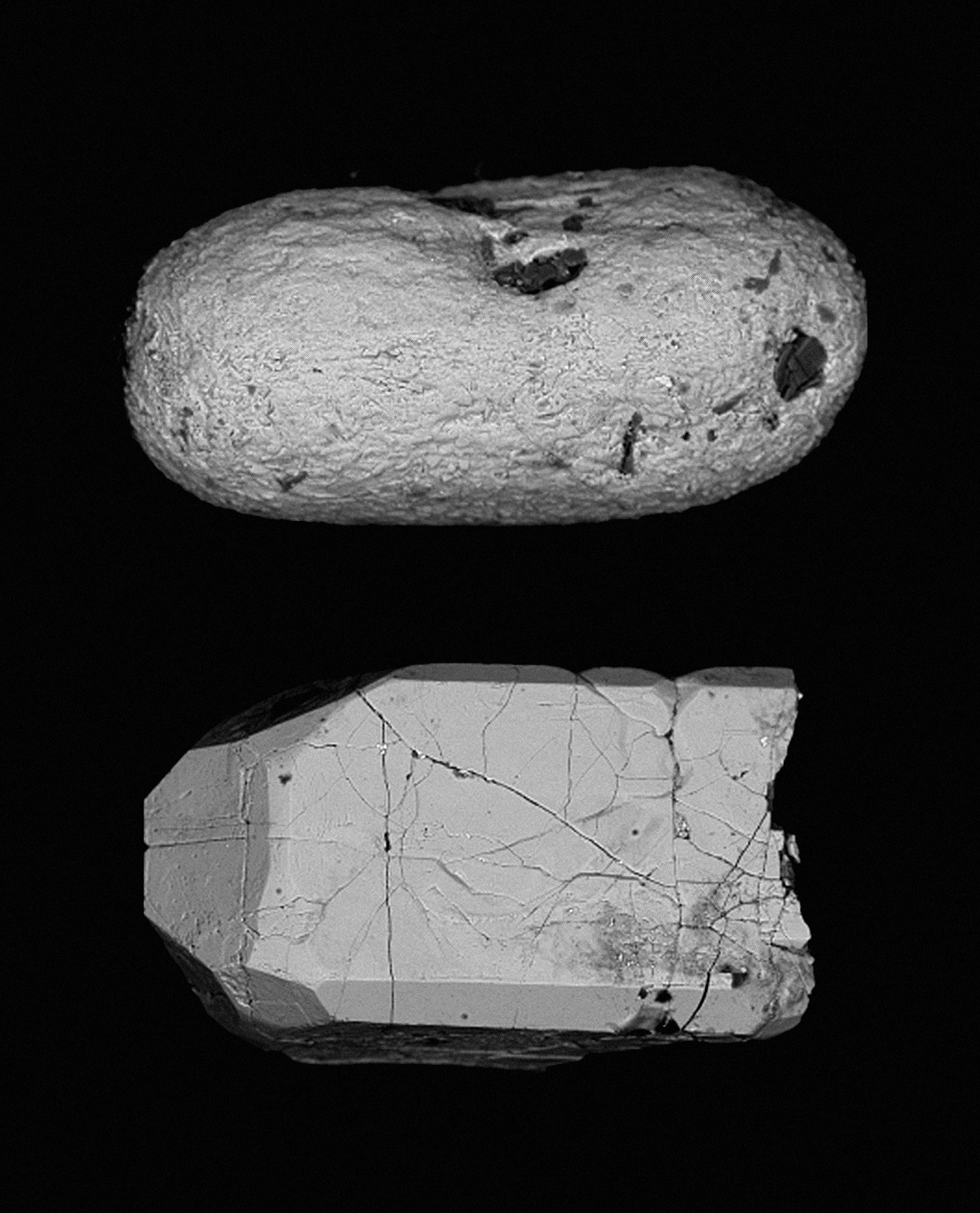 Backscatter electron micrograph of 4.4-billion-year-old detrital zircons from the Hadean metasediments of the Jack Hills, Narryer Gneiss Terrane, Western Australia
