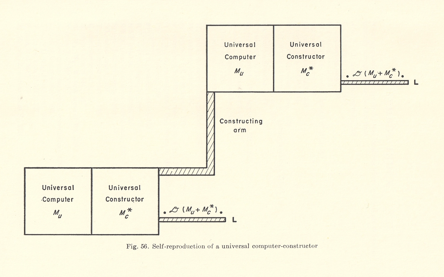 It’s possible for a trivially simple structure, like a seed crystal, to “reproduce” merely by acting as a template for more of the same stuff to crystallize around it. But a complex machine—one with any internal parts, for example—can’t serve as its own template. And if you are a complex machine, then, on the face of it, manufacturing something just as complex as you yourself are has a whiff of paradox, like lifting yourself up by your own bootstraps. However, von Neumann showed that it is not only possible, but straightforward, using a generalization of the Universal Turing Machine.