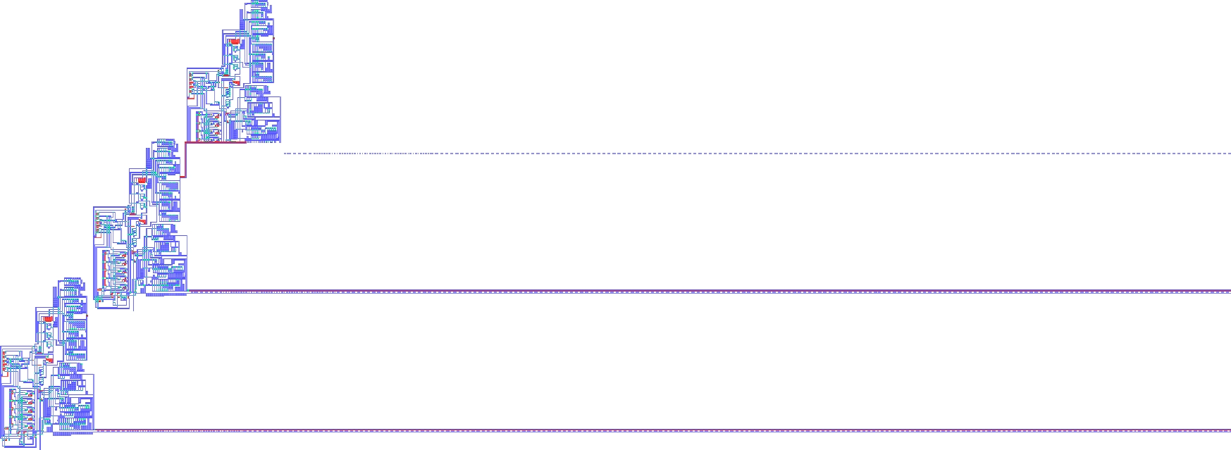 Implementation of von Neumann’s self-reproducing cellular automaton, Pesavento 1995. The second generation has nearly finished constructing the third (lines running off to the right are instruction tapes, much longer than shown).